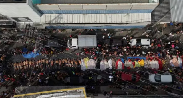 Imagem de drone mostra corpos levados a praça no Complexo da Penha, na Zona Norte do Rio de Janeiro, no dia 29 de outubro de 2025. — Foto: Ricardo Moraes/Reuters